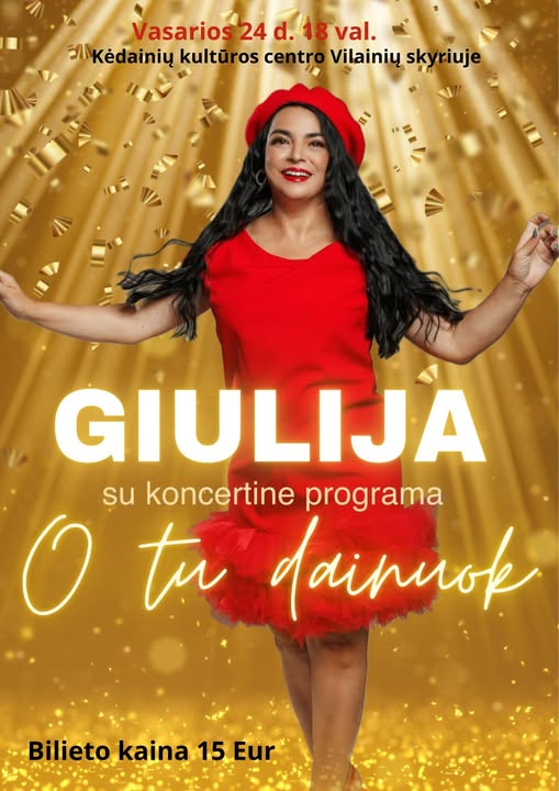 18 val. Giulijos koncertas. Bilieto kaina 15 Eur. Bilietus į koncertą galite įsigyti Kėdainių kultūros centro Vilainių skyriuje antradieniais, ketvirtadieniais : 15-18 val. ir penktadieniais: 10-16 val. arba pasiskambinę tel.nr. +370 686 69804. Koncerto dieną bilietai gali brangti.