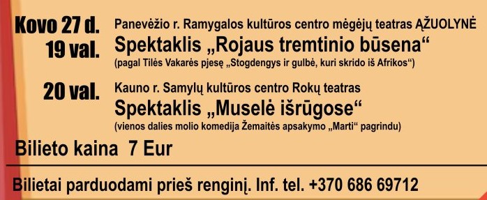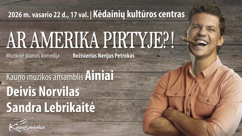 17 val. Deivis Norvilas ir Sandra Lebrikaitė muzikinėje komedijoje „AR AMERIKA PIRTYJE?!“ Bilietų kainos: 15 ir 17 Eur. Bilietai: https://kakava.lt/renginys/deivis-norvilas-ir-sandra-lebrikaite-muzikineje-komedijoje-ar-amerika-pirtyje/11398/23510 ir Kėdainių kultūros centro kasoje (nuo 15 iki 18 val.).