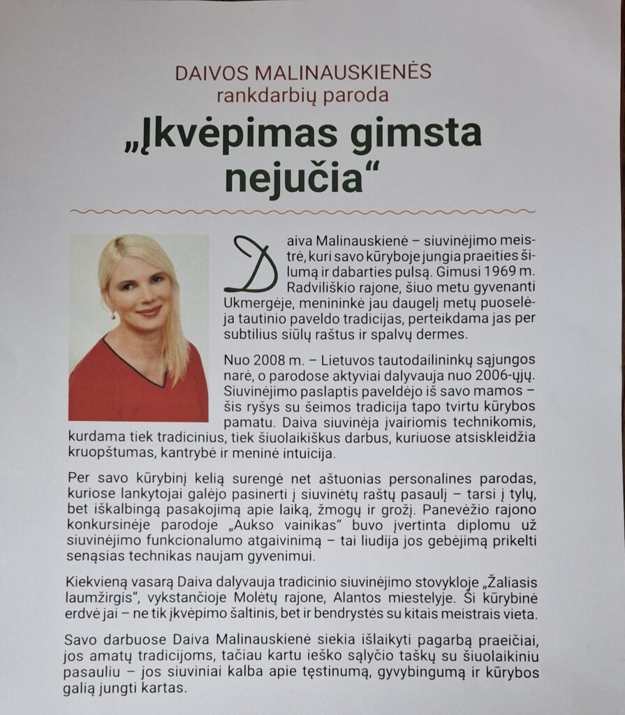 18 val. kūrybiniai-edukaciniai užsiėmimai „Skiautinių istorija“. Užsiėmimų metu iš įvairių medžiagų skiaučių bus kuriamas bendras paveikslas – kiekviena detalė taps istorijos dalimi, sujungianti praeitį ir dabartį. Tai puiki proga išlaisvinti fantaziją, pabūti drauge kūrybiškoje atmosferoje, prisiliesti prie rankdarbių tradicijos ir palikti savo įnašą į bendrą kūrinį. Užsiėmimai skirti visiems, norintiems patirti kūrybos džiaugsmą – patirties ar ypatingų įgūdžių nereikia.