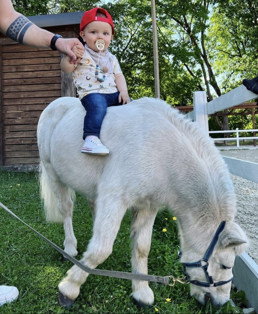 Sūnus Jonas (11mėn). pirmą kartą ant žirgo. 2023 m. gegužė.