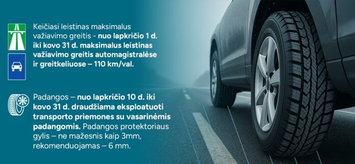 Nuo lapkričio 1 d. iki kovo 31 d. lengvaisiais automobiliais, krovininiais automobiliais, kurių didžiausioji leidžiamoji masė ne didesnė kaip 3,5 t, motociklais ir triračiais automagistralėse ir greitkeliuose leidžiama važiuoti ne didesniu kaip 110 km/val. greičiu.