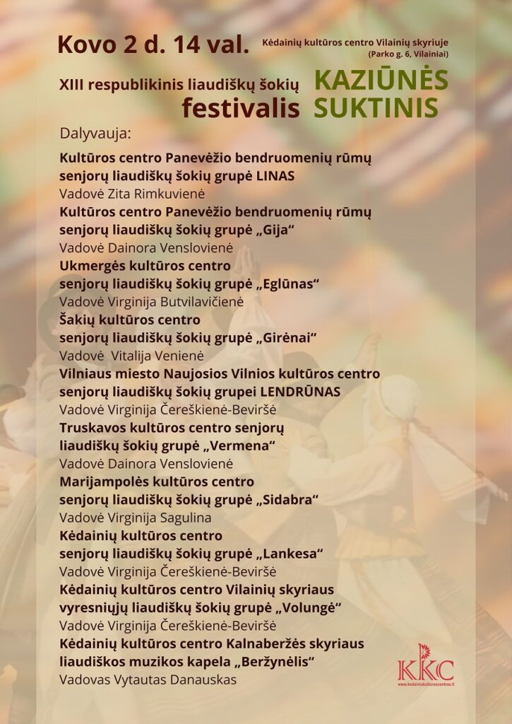 Kermošius veiks iki 14 val., o tada į sceną rinksis šokėjai. Į jau 13-ąjį kartą organizuojamą respublikinį liaudiškų šokių festivalį „Kaziūnės suktinis“ sugužės kolektyvai iš Panevėžio, Ukmergės, Šakių, Vilniaus, Marijampolės ir Kėdainių krašto.