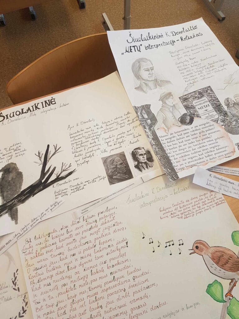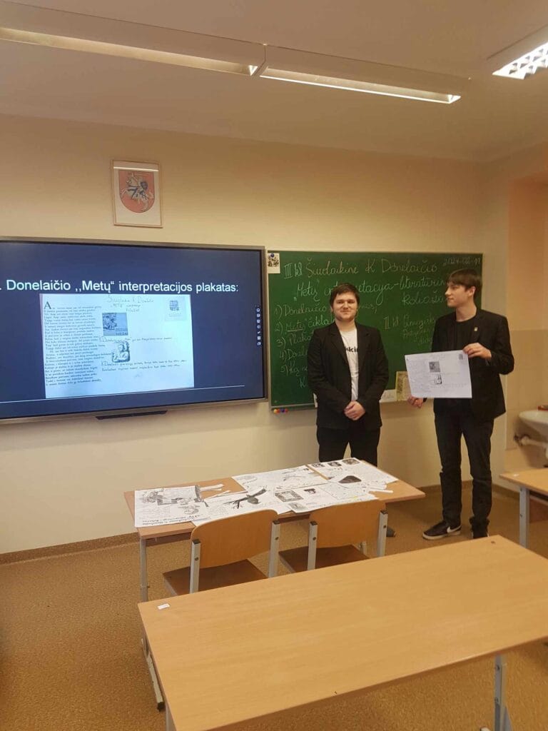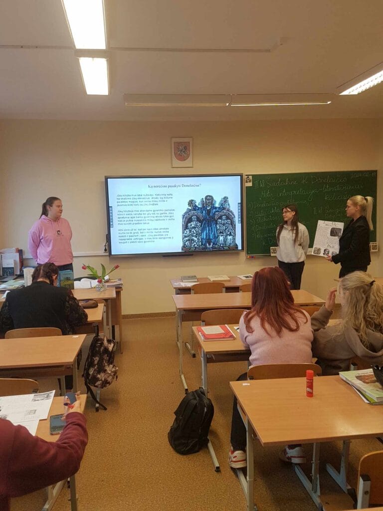 Pamoka žadėjo būti neįprasta. Jai mokiniai rengėsi, skaitydami K. Donelaičio „Metus“, analizuodami kūrinio ištraukas, atrinkdami tai, kas jiems buvo svarbu ir įsimintina. Pasiskirstę grupėmis sukūrė savo pristatymus grafine forma ant popieriaus lakštų ir skaidrėmis, demonstruotomis interaktyviajame ekrane. Kiekviena grupė pristatė savo mintis, o klasės mokiniai buvo įpareigoti pateikti pranešėjams klausimus. Ypač vertinga patirtis kiekvienam: ir papasakoti viešai, ir pateikti klausimus, ir į juos atsakyti.