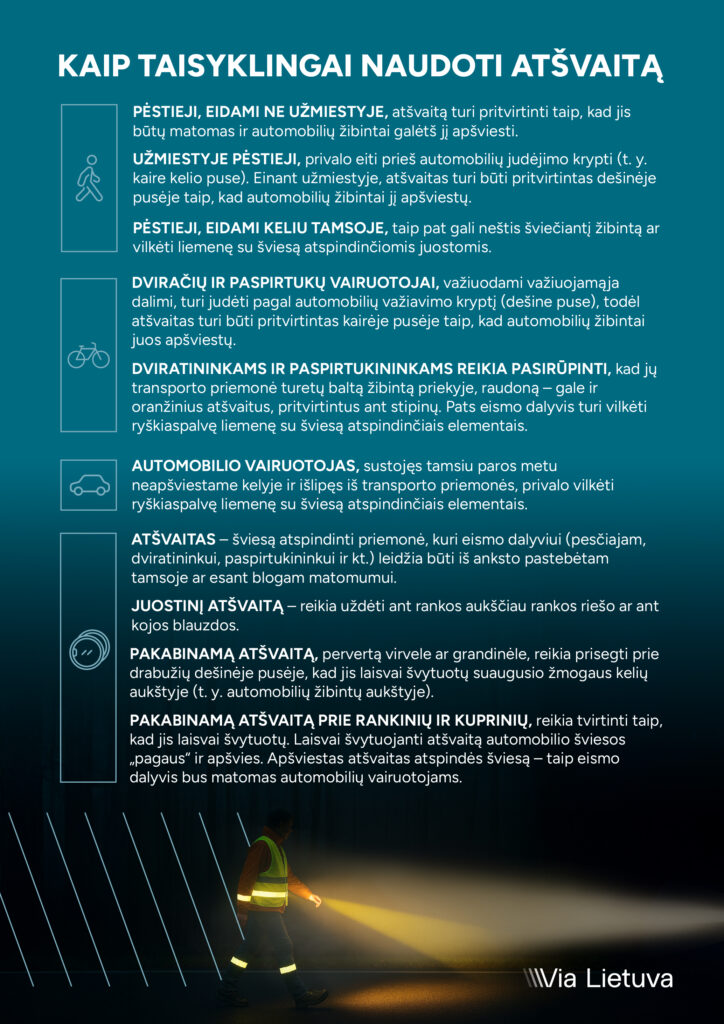 Akcijos iniciatoriai primena, kad užmiestyje pėstieji privalo eiti prieš automobilių judėjimo kryptį – kaire kelio puse. Tokiu atveju atšvaitai turi būti prisegti, uždėti ant dešinės rankos, kojos ar drabužių.