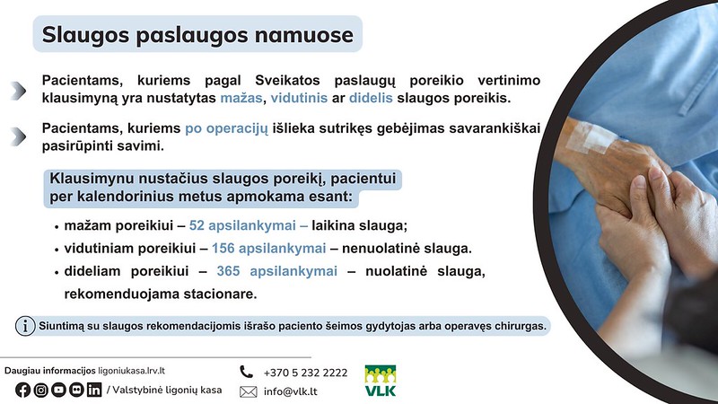 „Slauga namuose suteikia galimybę žmogui gauti tęstinę ir kokybišką priežiūrą savo aplinkoje, kai dėl sveikatos būklės jis nebegali savimi pasirūpinti ar nuvykti į gydymo įstaigą. Šios paslaugos ypač svarbios vyresnio amžiaus ar sunkiai sergantiems pacientams, kuriems reikia su sveikata susijusios priežiūros ir profesionalios pagalbos. Tai veiksminga alternatyva stacionarinei slaugai, leidžianti reikiamas paslaugas gauti neišvykstant iš namų“, – sako Valstybinės ligonių kasos (VLK) Paslaugų kompensavimo skyriaus patarėja Oksana Burokienė.