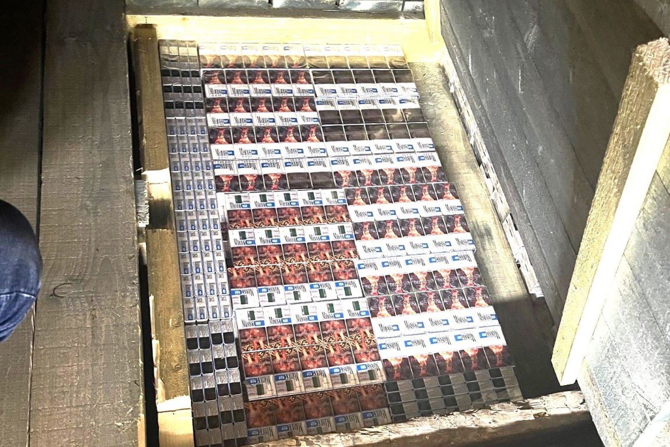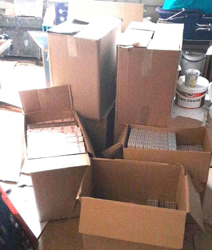 Per kratą gyvenamojo namo palėpėje įrengtoje slėptuvėje pasieniečiai aptiko 3 200 pakelių cigarečių „Minsk Capital QS“, „NZ Gold“, „Fest“ ir „Queen Menthol“ su baltarusiškomis banderolėmis bei 25 pakelius cigarečių „Marlboro“ be jų. Šių rūkalų vertė, įskaitant visus Lietuvoje privalomus mokesčius, – 13 356 eurai.