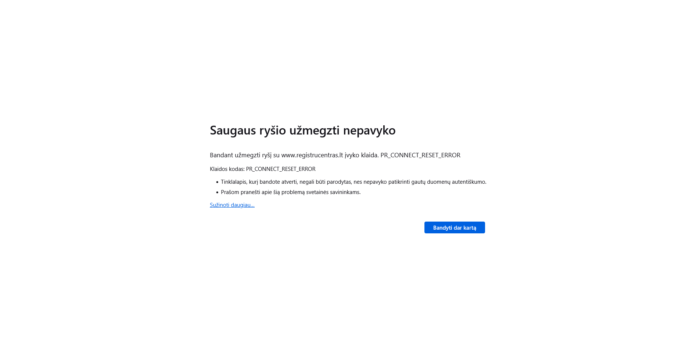 Interneto puslapyje registrucentras.lt neveikia paslaugų prisijungimo sistema, o bandant patekti į asmeninę ar įstaigų paskyrą išmetamas pranešimas, skelbiantis apie klaidą.