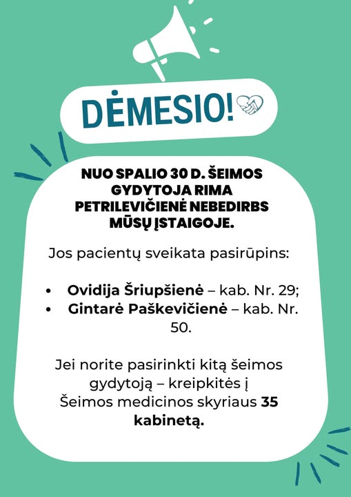 Kėdainių pirminės sveikatos priežiūros centras paskelbė, jog nuo 2025 m. spalio 30 d. gydytoja Rima Petrilevičienė nebedirba šioje gydymo įstaigoje bei informuoja, kurie gydytojai perims buvusius gydytojos pacientus.