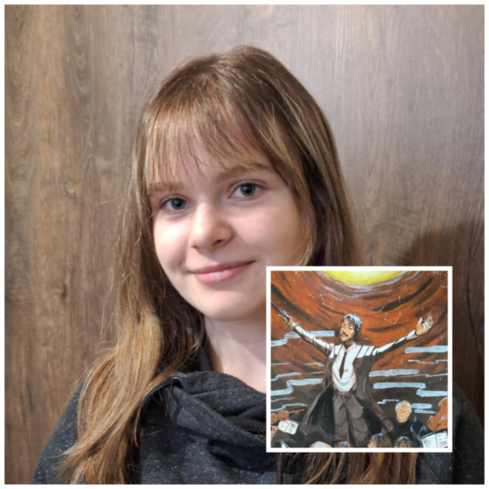 „Neprisimenu, kada pirmą kartą išgirdau apie M. K. Čiurlionį. Mane visada domino jo kūryba, kaip jis derino kiekvieną atspalvį, kad sukurtų tokius meno kūrinius. Šitą ir norėjau parodyti savo darbe – Čiurlionis diriguoja priešais žmonių minią, tai simbolizuoja, kaip jis iki šiol įkvepia mus savo muzika ir darbais, net kai praėjo tiek daug laiko. Darbą pavadinau „Tegyvuoja Čiurlionis“, nes tikiu, kad jo kūryba bus svarbi Lietuvai dar 150 metų“, – teigė Viktorija Juškaitė.