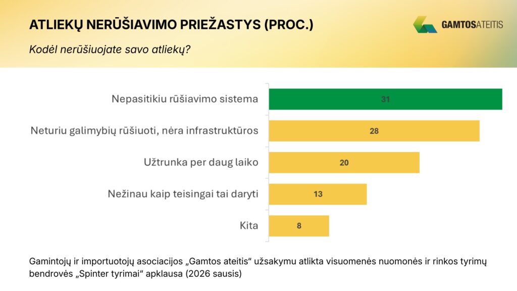 Tyrimas taip pat atskleidė pagrindines priežastis, dėl kurių dalis gyventojų nerūšiuoja atliekų. Dažniausiai minima kliūtis – nepasitikėjimas sistema, kurį įvardijo 31 proc. nerūšiuojančių respondentų. Dar 28 proc. teigė neturintys galimybių rūšiuoti dėl infrastruktūros stokos, 20 proc. sakė, kad tai užima per daug laiko, 13 proc. nurodė nežinantys, kaip tai daryti teisingai, o 8 proc. nurodė kitas priežastis.