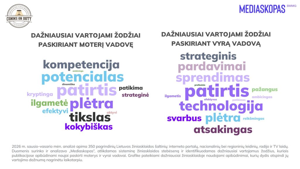 „Analizuodami tekstus matome, kad moterų vadovių atveju dažniau akcentuojama jų kompetencija, patirtis ar profesinės savybės. Tai tarsi lyderystės pagrindimo rėmas – pirmiausia parodoma, kad vadovė yra kvalifikuota ir kokią patirtį ji atsineša į pareigas“, – sako „Mediaskopas“ duomenų strategė Vilūnė Kairienė.