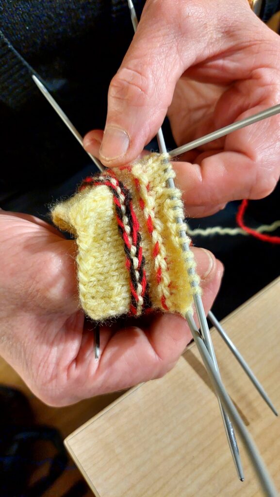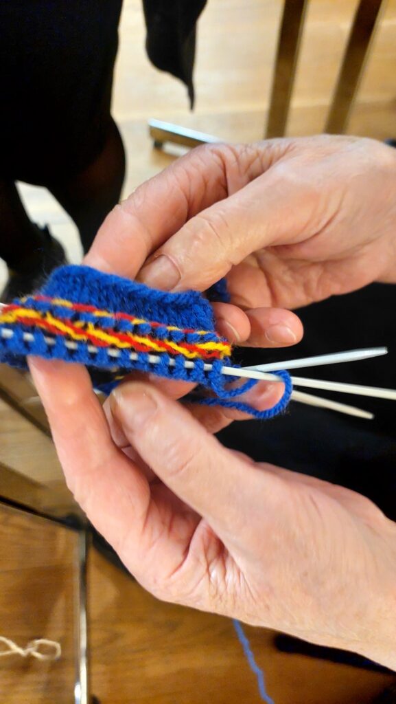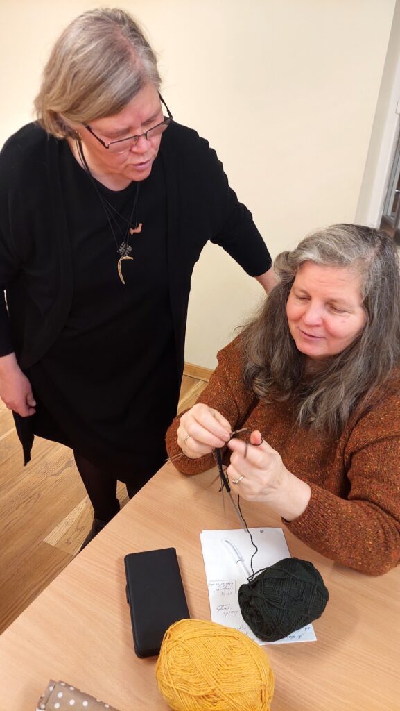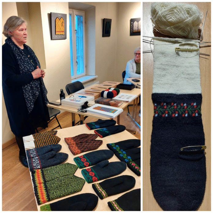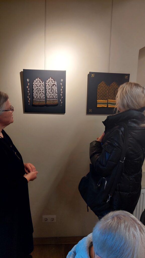 Po parodos atidarymo L. Bartašienė kėdainietėms vedė edukaciją – mokė megzti dvigubą kumštinių pirštinių riešelį.
