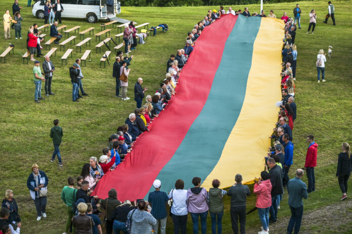 19 val. Liaudiškos muzikos ir amatų šventė „Po vasaros dangum“. Tautiškos giesmės giedojimas su viso pasaulio lietuviais / Bakainių piliakalnis.