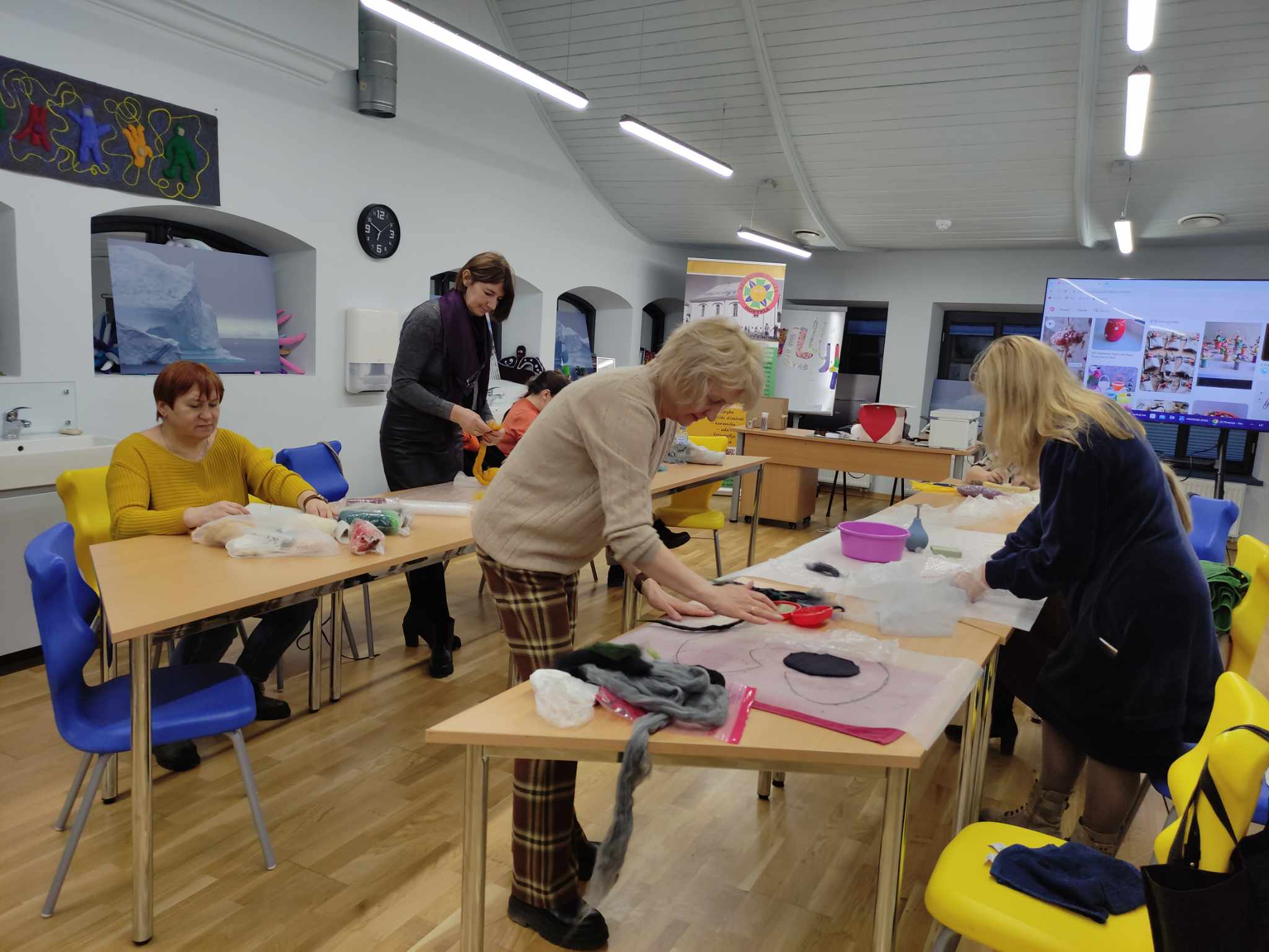 ,,Rudenį kvietėme jauną kūrėją, dailės mokyklos absolventę Nargizą Nurdinovą, kad ji pamokytų kaip dirbti kilpinio siuvinėjimo adatomis ir parodytų kaip kurti kilimus. Taip gimė nemaža kolekcija mažų ir didesnių kilimų – paveikslų. Vasarį pakvietėme anksčiau programą lankiusią profesionalią kūrėją iš vilnos – Ingridą Naciuvienę, kad ji pamokytų velti šalikus šlapiuoju būdu. Pamokos buvo įtraukiančios, o rezultatai puikūs.