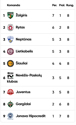 Pirmojo rato finiše žalgiriečiai čempionato turnyrinėje lentelėje žengia pirmi. Kėdainių komanda dalijasi 6-7 vietomis su Utenos „Juventus“ (3-5) krepšininkais.